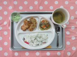 2026.01.14 わかめごはん 大根の味噌汁 竹輪の磯辺揚げ 野菜の和風煮 青りんごゼリー たんぱく質・・・12.4g エネルギー・・・419Kcal ※3歳~5歳児の栄養価を記載しています。2歳児の栄養価は3歳~5歳児の75%の値です。
