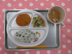 Home > 今日の給食 > わかめご飯 カレーコロッケ 水菜のサラダ とん汁