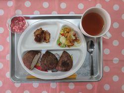 2026.02.13 ココア揚げパン ミネストローネ チキンソテーBBQソース コーンフレークサラダ いちごゼリー たんぱく質・・・12.4g エネルギー・・・335Kcal ※3歳~5歳児の栄養価を記載しています。2歳児の栄養価は3歳~5歳児の75%の値です。