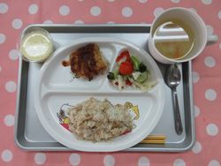 2025.09.26 シーチキンライス コンソメスープ 白身魚のフライ イタリアンサラダ カスタードプリン たんぱく質・・・16.2g エネルギー・・・366Kcal ※3歳~5歳児の栄養価を記載しています。2歳児の栄養価は3歳~5歳児の75%の値です。