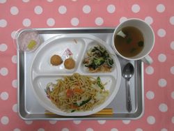 Home > 今日の給食 > ジャガイモ入り焼きそば(栃木県) 揚げボール 大根サラダ ナルトのスープ 桃ゼリー