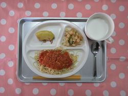 2026.01.30 スパゲッティミートソース ミルク じゃが芋とツナのサラダ バナナ たんぱく質・・・15.4g エネルギー・・・388Kcal ※3歳~5歳児の栄養価を記載しています。2歳児の栄養価は3歳~5歳児の75%の値です。