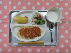 2025.11.06 スパゲッティミートソース ミルク 花野菜サラダ バナナ たんぱく質・・・14.0g エネルギー・・・361Kcal ※3歳~5歳児の栄養価を記載しています。2歳児の栄養価は3歳~5歳児の75%の値です。