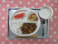 2025.12.12 チキンカレー ミルク カラフルサラダ ルビーグレープフルーツ たんぱく質・・・13.3g エネルギー・・・401Kcal ※3歳~5歳児の栄養価を記載しています。2歳児の栄養価は3歳~5歳児の75%の値です。