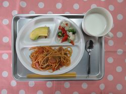 2026.02.27 ナポリタンスパゲッティ ミルク 花野菜サラダ バナナ たんぱく質・・・12.3g エネルギー・・・348Kcal ※3歳~5歳児の栄養価を記載しています。2歳児の栄養価は3歳~5歳児の75%の値です。