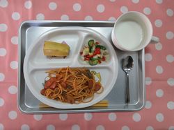 2025.12.05 ナポリタンスパゲッティ ミルク 花野菜サラダ バナナ たんぱく質・・・14.6g エネルギー・・・412Kcal ※3歳~5歳児の栄養価を記載しています。2歳児の栄養価は3歳~5歳児の75%の値です。