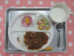 2024.10.25 ハヤシライス ミルク クラッカーサラダ ピーチゼリー たんぱく質・・・15.6g エネルギー・・・492Kcal 2歳児 たんぱく質・・・11.7g エネルギー・・・369Kcal