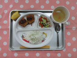 2025.10.03 パセリライス コンソメスープ チキンカツ イタリアンサラダ バナナ たんぱく質・・・13.2g エネルギー・・・402Kcal ※3歳~5歳児の栄養価を記載しています。2歳児の栄養価は3歳~5歳児の75%の値です。