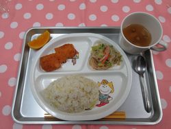 Home > 今日の給食 > 沢庵ご飯 イカフライ 和風春雨サラダ なめこのみそ汁 オレンジ