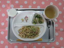 2026.02.06 焼きうどん 里芋の味噌汁 きゅうりの甘酢漬け みかんヨーグルト たんぱく質・・・14.4g エネルギー・・・371Kcal ※3歳~5歳児の栄養価を記載しています。2歳児の栄養価は3歳~5歳児の75%の値です。」