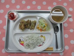2024.05.29 菜めし きのこの味噌汁 竹輪の磯辺揚げ そうめんサラダ いちごのブラマンジェ たんぱく質・・・13.1g エネルギー・・・440Kcal 2歳児 たんぱく質・・・9.8g エネルギー・・・330Kcal