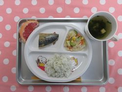 Home > 今日の給食 > 菜飯 さわらの西京焼き かに風味サラダ えのきのすまし汁 グレープフルーツ