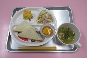 Home > 今日の給食 > 食パン・ジャム チーズオムレツ スパゲッティサラダ レタスのスープ