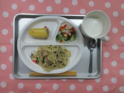 2025.10.09 鶏肉と小松菜の和風スパゲッティ ミルク ミックスサラダ バナナ たんぱく質・・・18.4g エネルギー・・・422Kcal ※3歳~5歳児の栄養価を記載しています。2歳児の栄養価は3歳~5歳児の75%の値です。