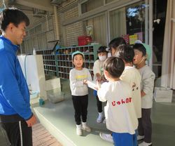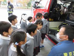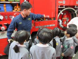 素早く着替え、背中に10㎏の重さのボンベも背負い、あっという間に消防者に乗りこむ姿を見て圧倒されていた子ども達です。「着替えるの早いね」「ほんと早いね」と隣の友だちとこっそり話していましたよ。