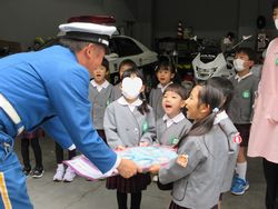 今日は松組(年長組)が警察署と消防署へカレンダーを渡しに行きました。