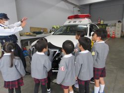 パトカーの赤色灯が上に上がったところを見せていただくと「なんで上に上がるんですか?」とすぐ質問していた松組の子ども達。すると警察署員の方も優しく「遠くまで見えるようにするんだよ」と教えていただき、「そっかあ、遠くの人も見えないと困るよね」と納得していました。