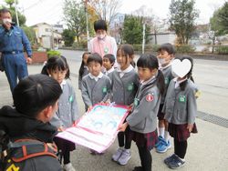 11月23日は勤労感謝の日でした。近隣の警察署や消防署、京王バスや園医の歯医者さん、日頃園内でもお世話になっている方々へ手作りのカレンダーを渡しました。
