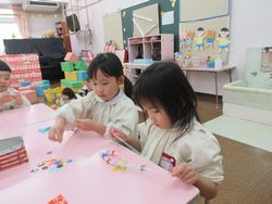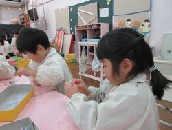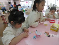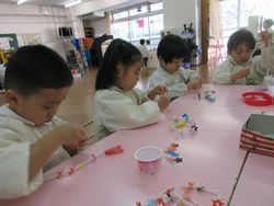 細かい作業なので、子どもたちはみんな真剣そのもので、遊んでいる時とは打って変わって、とても静かでした。何ができたかな?それは・・・お別れ会までのお楽しみです。