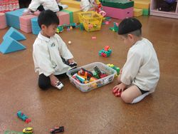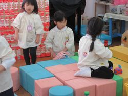 乗り物の「駅」で、ひまわり組の子どもが乗り物を待っていると、不安定な駅が倒れてしまいました。すると、梅組のお兄さんが、「こうしたらいいよ」とカラー積み木を持ってきてくれました。
