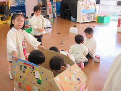 なぜかというと、梅組(年中組)のお兄さん、お姉さんが遊びに来てくれているからです。今日は松組(年長組)とのお別れ会に向けて、3クラス一緒に製作をするために、集まりました。