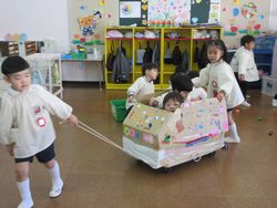 ひまわり組と桜組の大好きな乗り物も、お兄さん、お姉さんが引っ張ってくれます。嬉しいですね。