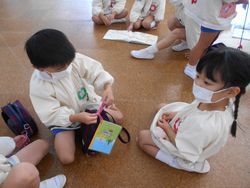 鞄に落ちないように毛糸で結んであるのですが、自分ではまだ、なかなか取れない梅組(年中組)の子どもたちです。困っているところへ……