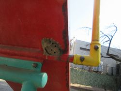 すると「先生!!ちょっと来て!はちの巣があるから、見て!」「大変!早く来て」と子ども達の大きな声で呼ばれました。滑り台の近くまで走っていくと…