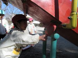 ちゅうりっぷ組(2歳児)もお兄さんやお姉さんと一緒に階段のぼって滑り台をしたり、三輪車に乗ったりしています。