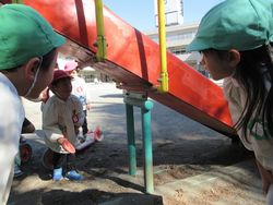砂場の近くでは、水の張ったたらいから、おたまで一生懸命水を運んでいたひまわり組(満三歳児)何をしているの?とたずねると「おとしあなを作っているんだよ」という返事が返ってきました。(おとしあな???と大きな疑問でしたが、一生懸命何度も往復しながら、水はこびをしていたので、見守りました)