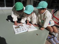 結局何も出ては来ませんでしたが、これは何のはちの巣だったんだろう?何て名前のはちなんだ?と保育室にある昆虫図鑑を持ってきて調べ始めた松組(年長組)。