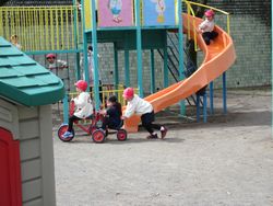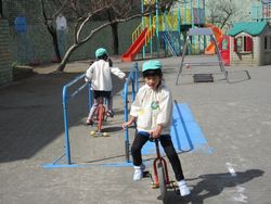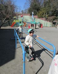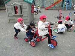 三輪車の後ろに、小さなお友達用の三輪車をつないで、梅組(年中組)のお兄さんたちが運転してくれてます。“らくちん!らくちん!”