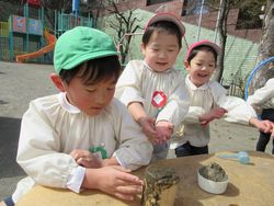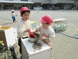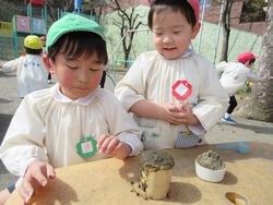 「先生見て!この給食で出た“豚汁”作ったよ」と砂場の用具を使って見せに来てくれました。お椀に入っているので、本物そっくり?!