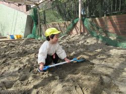 砂場では大きなスコップを使って、一生懸命砂を掘り、山を作っていたちゅうりっぷ組(2歳児)。「重たいね、頑張って!」と声をかけると「思いたいよ!よいしょ、よいしょ」と自分で掛け声をかけながら、山作りをしていました。大きなスコップも扱えるようになりました。