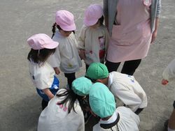 桜組(年少組)が先生と一緒に中あてをしているところへ「入れて!」と松組も参加。外野を決める時には松組がリードして決めてました。桜組は初めての鬼決めの仕方に????のようでした。お兄さん、お姉さん達から遊びながらいろいろなルールを教えてもらっているようです。