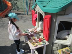お家の周りには、梅組が作った砂や飾りに梅の花びらや草等をつかったケーキやお菓子が並んでいます。「すみません。これは何円ですか?」と松組のお客さんが来たことで「あっそれは500円です」「今日のおすすめはどれですか?」「今日のおすすめはこちらです」とお店屋さんごっこが始まっていました。