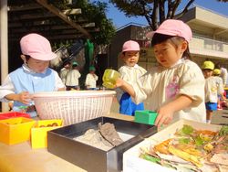 ひまわり組(満三歳児)、桜組(年少組)は遠足や散歩で沢山拾ってきたどんぐりや園庭に落ちている葉っぱを使ってごっこ遊びをしました。