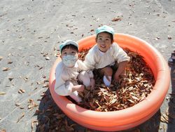 保育室に戻ると「先生、ポケットの中にたくさんはっぱが入っていた」「さっきトイレに行ったら、はっぱがでできた」「はっぱプール楽しかった。明日もやりたいね」「たくさんはっぱ集めて、はっぱプールしよう」と楽しそうに話していた子ども達でした。