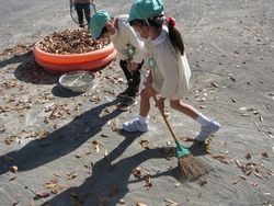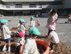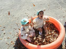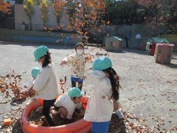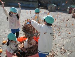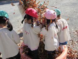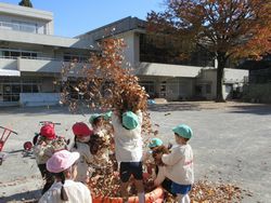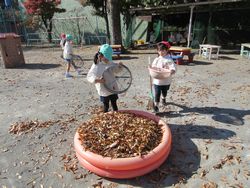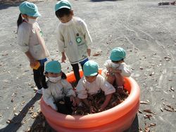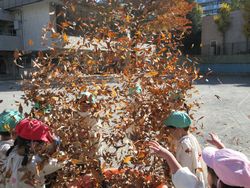 秋になると園庭には落ち葉がいっぱいです。先生達は園庭のはっぱを見て、はぁ….と大きなため息が出てしまいますが、風が吹いて沢山の葉っぱがひらひらと舞っていると「わあ、はっぱの雨だね」「きれいだね」「またはっぱのプールで遊べるね」と子ども達は大喜び。