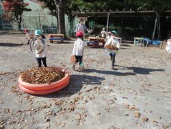 はっぱプールの中に入っていたはっぱがなくなると、「はっぱプールのはっぱがなくなったから、みんな集めて!!」と声を掛け合い、はっぱ集めが始まりました。