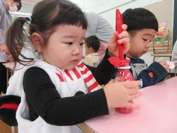 帽子の後はサンタさんのヨーヨーも作りました。お花紙や綿を容器に入れてふたをするとヨーヨーの出来上がり。
