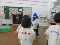 誰かが現れました。みんなびっくりして、中には先生の後ろに隠れる子どももいました。