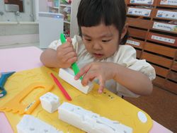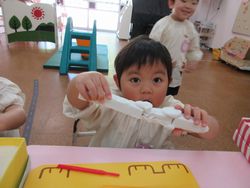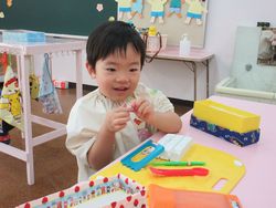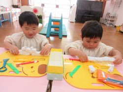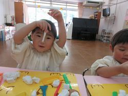 新入園児も進級園児も新しい粘土になったので、はじめは粘土が硬くて、みんな苦戦していましたが、遊んでいくうちに、伸ばしたり、丸めたりして、いろいろなものを作り始めました。手、指先を使って遊ぶ遊びは、小さいうちにたくさんできるといいですね。