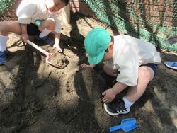 松組の子どもが「うーん、うーん」と言っていたので、「どうしたの?」と聞いてみると、「砂入れすぎちゃったから、持てないんだよ」と言っていました。どうやら入れ物に砂を入れて運ぼうとしたところ、砂を入れすぎて重くなったこと、そして入れ物も一緒に埋まってしまい、持てなくなったようです。
