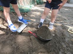 入れ物の下に、シャベルを入れて、入れ物を浮かせて、そこから手を入れていました。入れ物は砂から出せましたが、まだ重くて持ち上げられないようです。最終的に砂を少し捨てて、持ち上げていました。よく考えましたね。