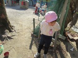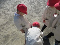 梅組(年中組)は何をしているのかな? たずねてみると「今からバナナ鬼をするから、鬼決めてるの」「バナナ鬼???」と聞くと「今学校でやってるんだよ(お兄さんの小学校で流行っているらしいです)教えてもらったようで、早速友達に教えてあげて遊び始めていました