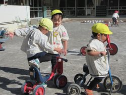 ひまわり組(満三歳児)はお兄さんやお姉さんのように自由に走り回ろうと、三輪車にまたがりましたが……なかなか前に進まない。ペダルを漕ぐ力がまた弱いのでちょっとまだ難しいようです。でも自由に走り回ろうという気持ちはあるようです!