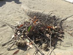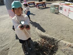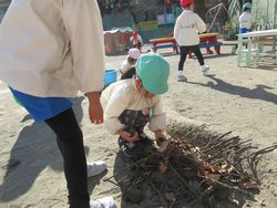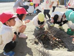 こちらの松組(年長組)は園庭に落ちていた木々を集めて、たきびのようにしていました。「見て!たきにの中にお芋を入れて、焼き芋作っているの」「たきびには葉っぱも必要だから、葉っぱも探さないと」と言いながら、園庭中捜しまわっていました。