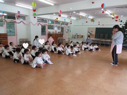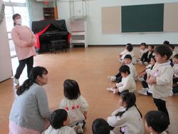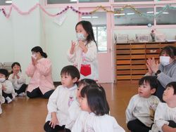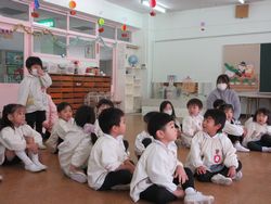 「12月に行われたことで、お父様やお母様など家族の人たちに見せてあげたことは何でしょう」「作品展!」と元気よく答えてくれた梅組(年中組)でした。