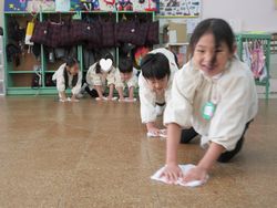 終業式が終わり、保育室に戻ってから保育室の大掃除です。初めての?雑巾掛けをきゃあきゃあ言いながらみんなでおこなっていました。お部屋はきれいになったかな?